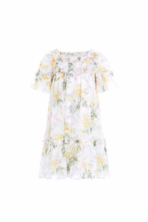 The Rose Bella Chiffon Kids Dress in Moonshine/Yellow. This dress features an enchanting antique-inspired print of large rose blooms and trailing florals, captured from early 1900s hand-painted artwork. Crafted from soft organic cotton with a textured dobby weave, this dress is a new season favourite.