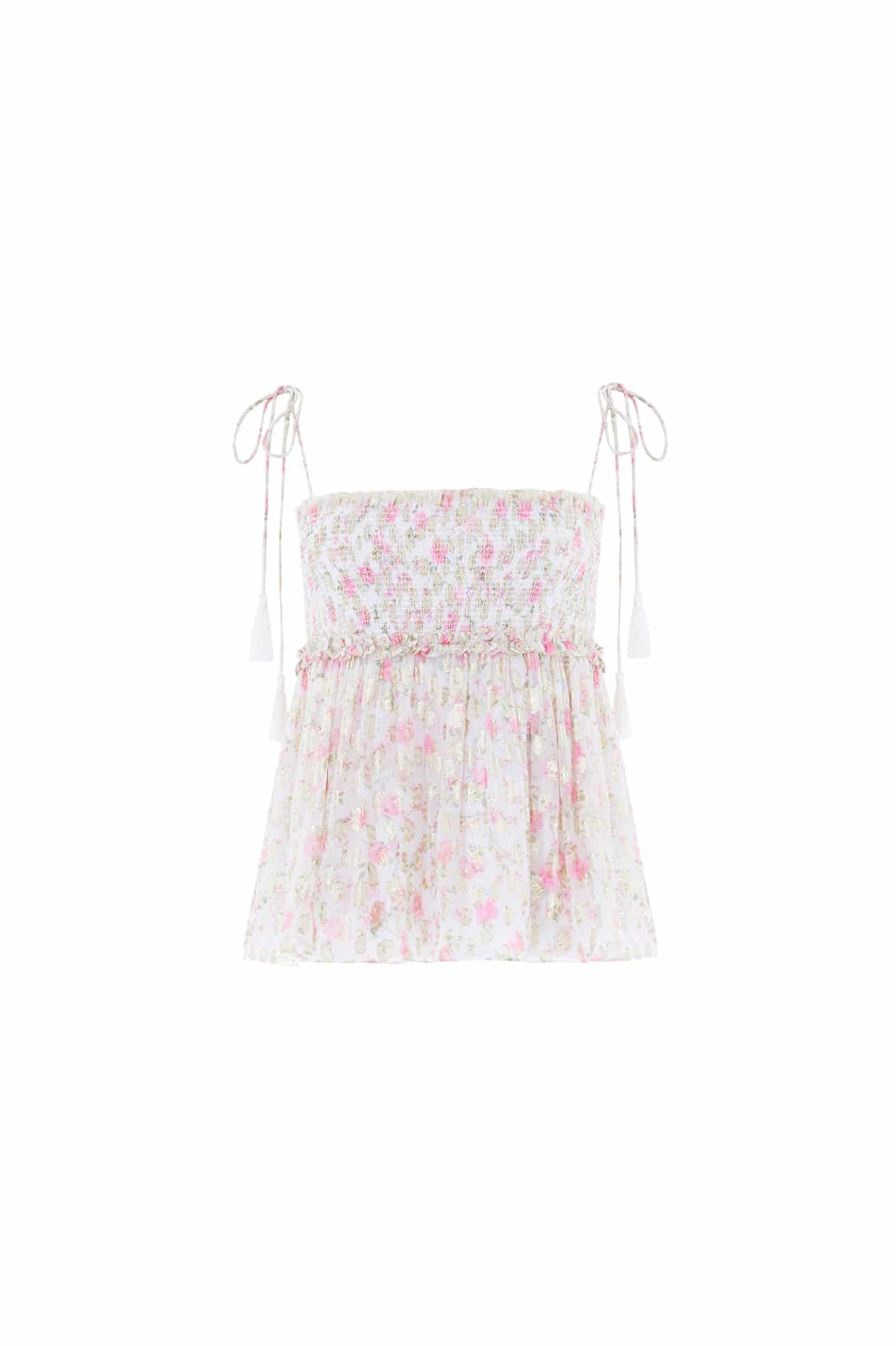 The Rose Ditsy Lurex Tie Top in Moonshine/Pink features a romantic floral print inspired by 1800s hand-painted wallpaper, with a subtle leopard print on glittering gold lurex georgette. The shirred neckline is edged with signature frills, and delicate shoulder ties are finished with braided silk tassels for an elegant touch. With a relaxed fit for comfort, this cami top pairs perfectly with the Rose Ditsy Lurex Micro Mini Skirt for a complete look.