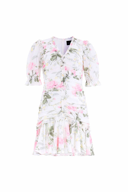 - Floral printed crepe decorated with printed ruffles