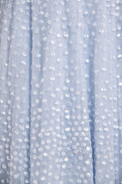 NEEDLE & THREAD EXCLUSIVE. The Scatter Dot One-Shoulder Mini Dress in Dusk Blue. This embellished dress is decorated with exquisite shimmering dot motifs, undulating in wave formations for a captivating glittering effect. This dress features a sweeping floor-length cape sleeve for romantic detailing and a statement look. The flattering one shoulder neckline is trimmed with signature Needle & Thread tulle frills. The skirt is made up of generous layers of net and tulle with sweeping hemline. The perfect dress for an upcoming special occasion.
