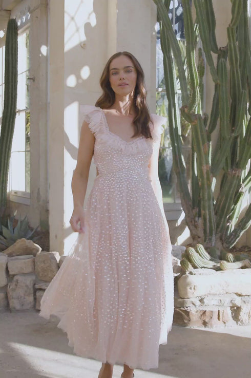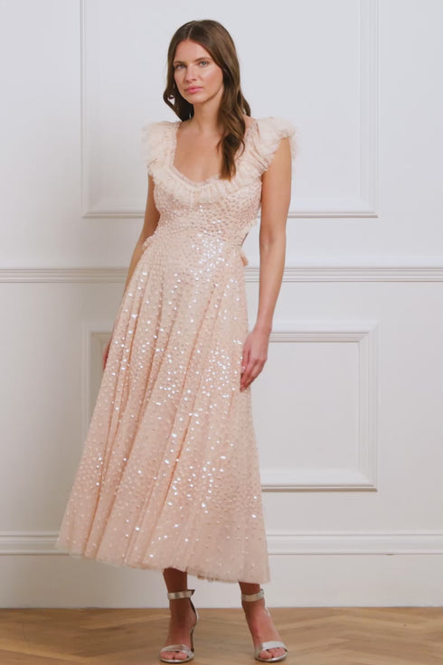 The Scatter Dot Ruffle Backless Ballerina Dress in Apricot. This dress features shimmering dot motifs that fade towards the hem for a captivating glittering effect. The backless design adds a playful, romantic touch, while frothy tulle sleeves and signature Needle & Thread ruffles enhance the neckline and back. A flattering V-shaped waist panel completes the look. The high-shine sequins, with a foil coating, add a lustrous finish. This enchanting dress is perfect for any special occasion.