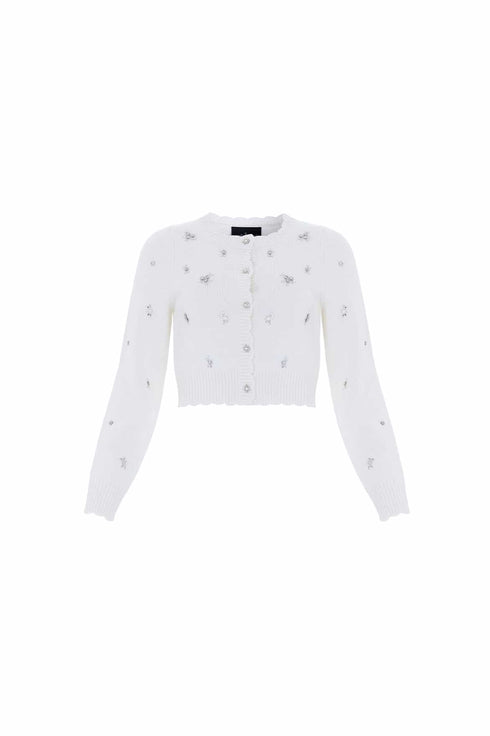 The Scattered Floral Embellished Short Cardigan in Cream. This cardigan is inspired by delicate vintage ditsy floral prints. Beautifully embellished with crystal gems scattered across the front and sleeves of the cardigan. Developed in a soft, merino wool with a blend of cashmere for a feminine texture. This cardigan has a short silhouette with slim fit sleeves and body. Designed with a round neck, scallop detailing and jewel buttons for a signature Needle & Thread look. A wardrobe staple you'll forever treasure.
