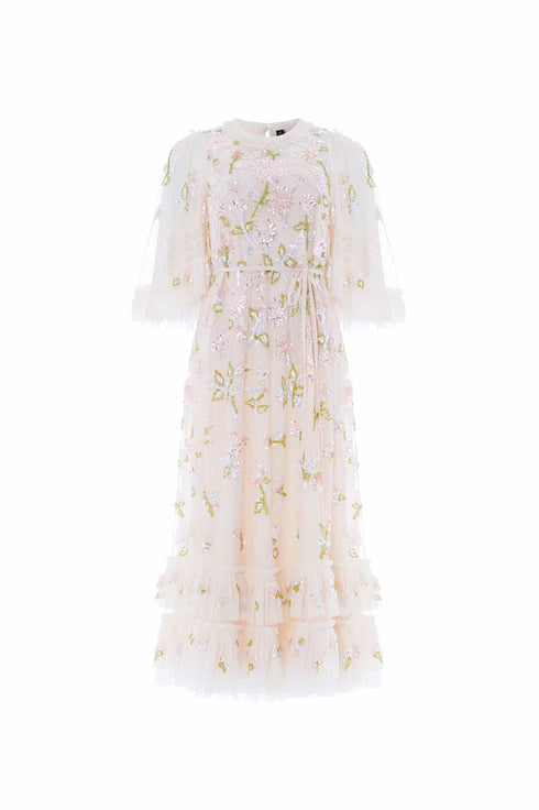 The Sequin Dandelion Gloss Ballerina Dress in Cream is inspired by Victorian botanical artist Marianne North. This dress features vibrant, shimmering dandelion floral sequins that delicately scatter towards the hem, creating a radiant effect. The sequins have a high-shine gloss finish, enhanced by a foil coating. With a loose, floaty silhouette and voluminous sleeves, this romantic dress is perfect for any special occasion.