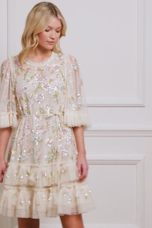 The Sequin Dandelion Gloss Mini Dress in Cream is inspired by Victorian botanical artist Marianne North. This mini dress features shimmering dandelion floral sequins that delicately scatter towards the hem, creating a radiant effect. The sequins have a high-shine gloss finish, enhanced by a foil coating. With a loose, floaty silhouette and voluminous sleeves, this romantic dress is perfect for any special occasion.
