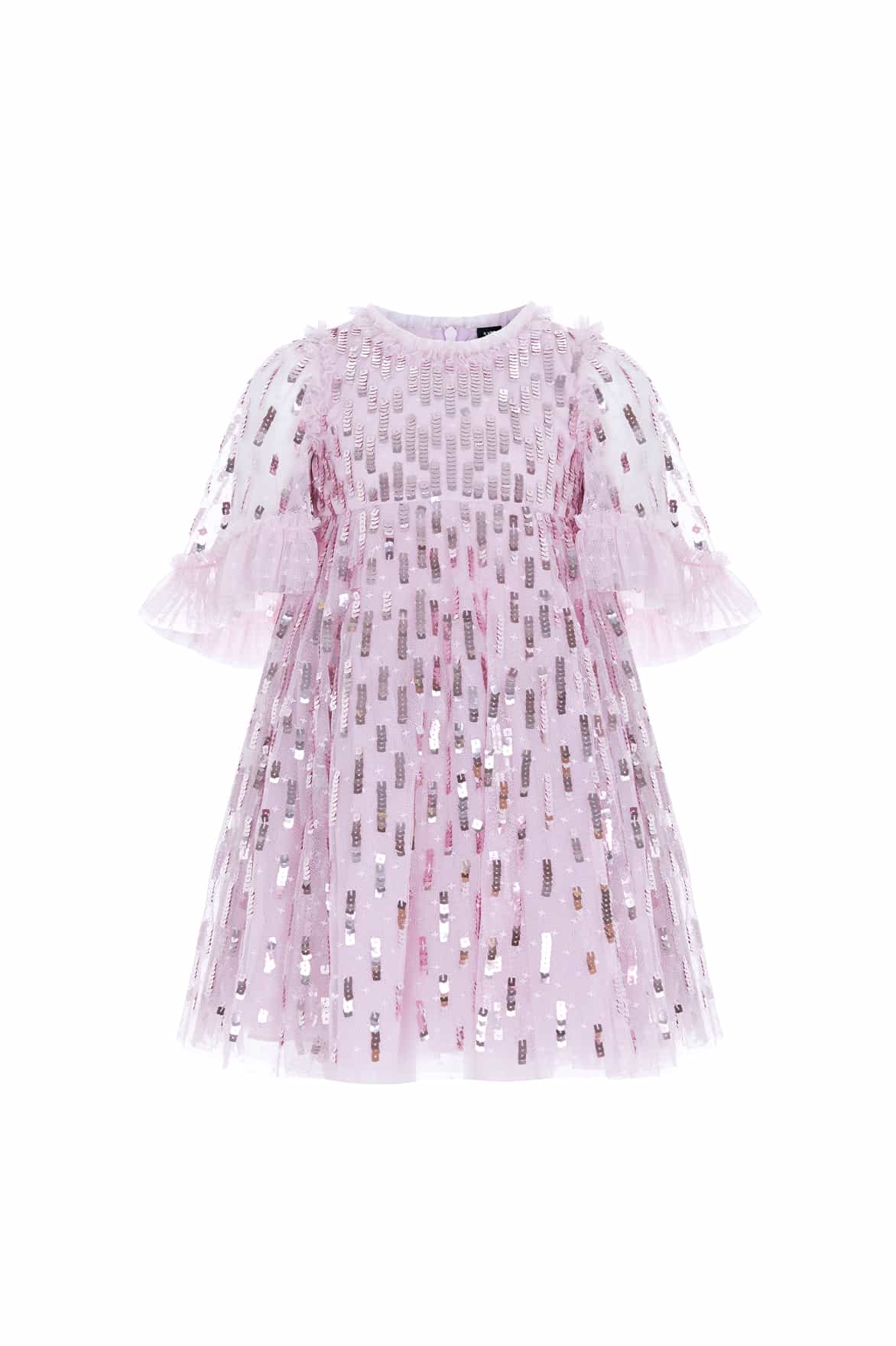 NEW SEASON. The Sequin Dash KIDS Dress in Mauve. This pretty dress is decorated with statement square sequins designed in a staggered linear layout for an all-over shimmer. Developed with a net-layered skirt creating a generous, voluminous silhouette. Featuring signature playful voluminous sleeves and gathered tulle frills at the hem. A truly magical piece for all their upcoming special occasions.