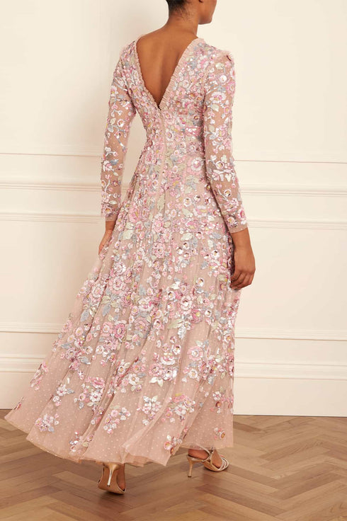 The Sequin Paradise Long Sleeve Gown in Sand. This gown is beautifully embellished with an intricate sequin artwork, inspired by one of our key prints - paradise garden. The sequins are depicted in rich tones of pink and greens creating this enchanting floral artwork. Developed with generous layers of net to create a show-stopping skirt shape. A true Needle & Thread statement piece.