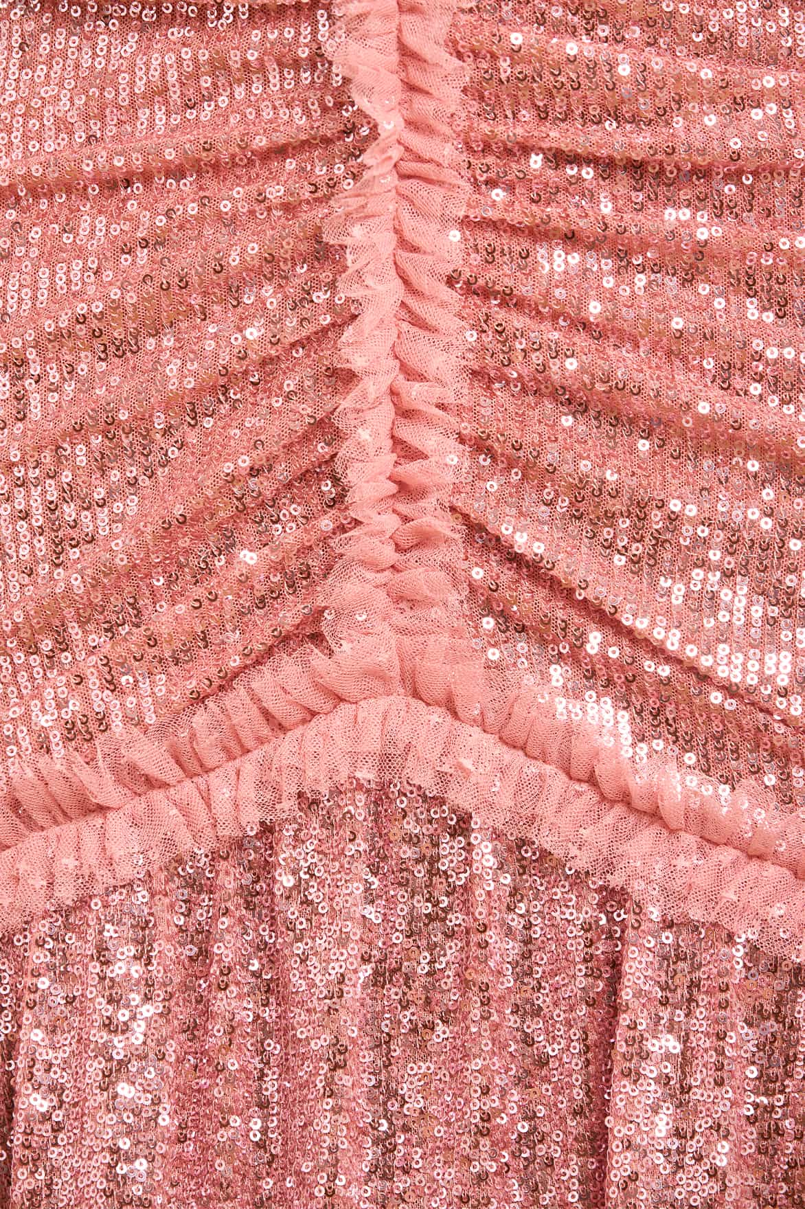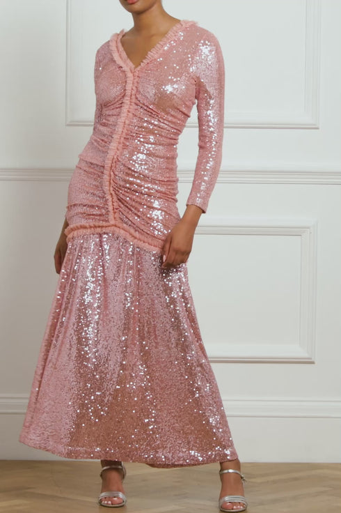The Starlight Long Sleeve Gown in Rose Blossom. Specially developed all-over sequin fabric is created using the tiniest 3mm sequins, carefully and delicately stitched to the stretch mesh base to create a shimmering effect. Expertly draped in our London atelier, the fabric is gathered with tulle frill details to perfect the flattering silhouette and add statement Needle & Thread styling. Fully lined in heavier-weight power mesh, the gown ensures ultimate fit and comfort. The frill-edged V neckline and slim sleeves complete the elegant silhouette. The perfect gown for an upcoming special occasion.
