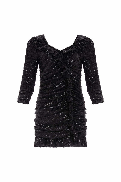 The Sunbeam Rouched Long Sleeve Micro Mini Dress in Graphite. A brand new style for the season ahead. This dress is made from specially sourced sequin fabric, created using the tiniest sequins carefully stitched to the stretch mesh base, creating an all-over shimmering fabric. This mini dress is developed with a flattering silhouette using an expert technique featuring folded frill details for Needle & Thread signature elements. This style is fully lined in power mesh to create ultimate fit and comfort. The perfect piece to shine in golden hour.