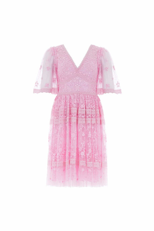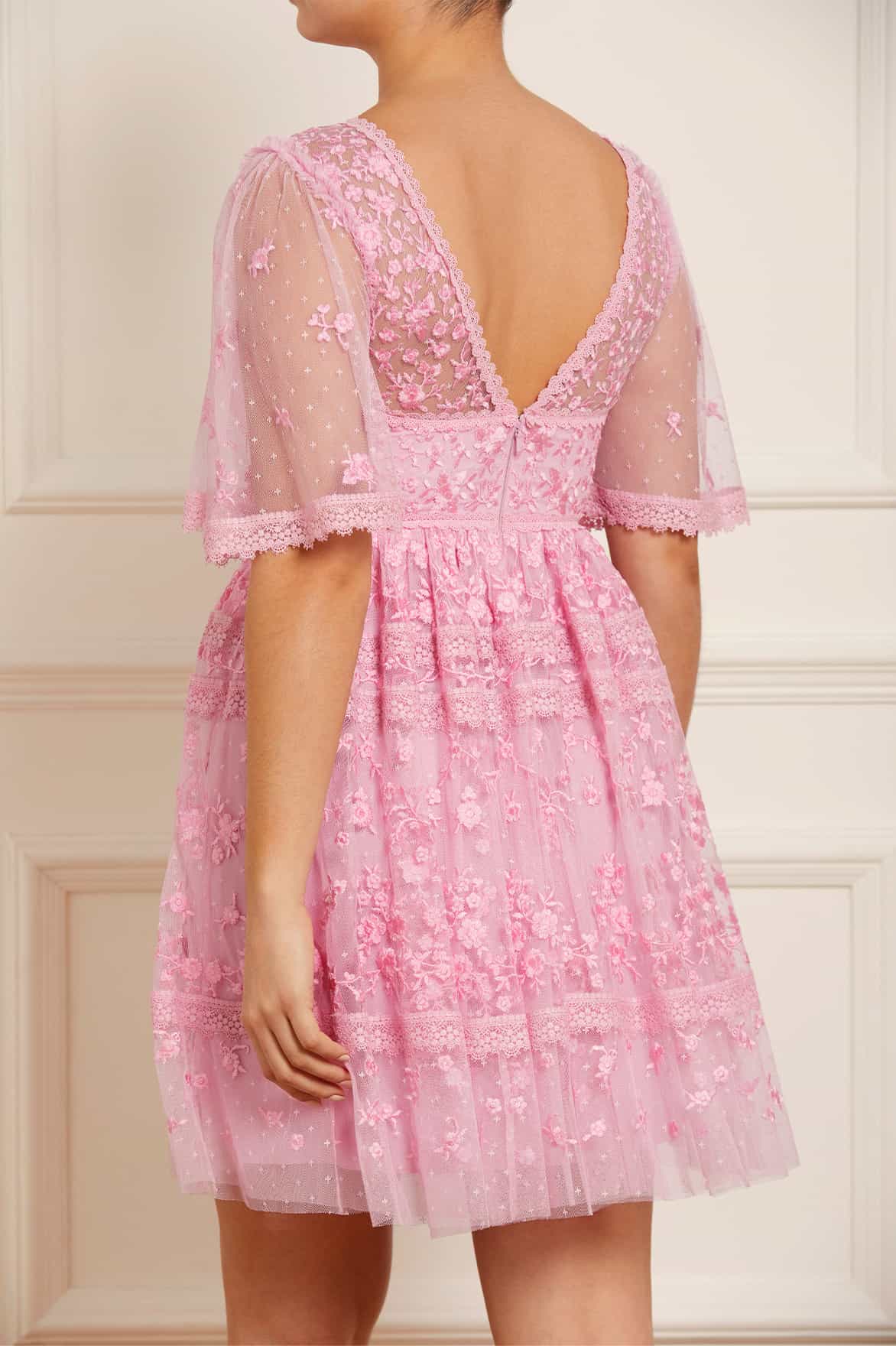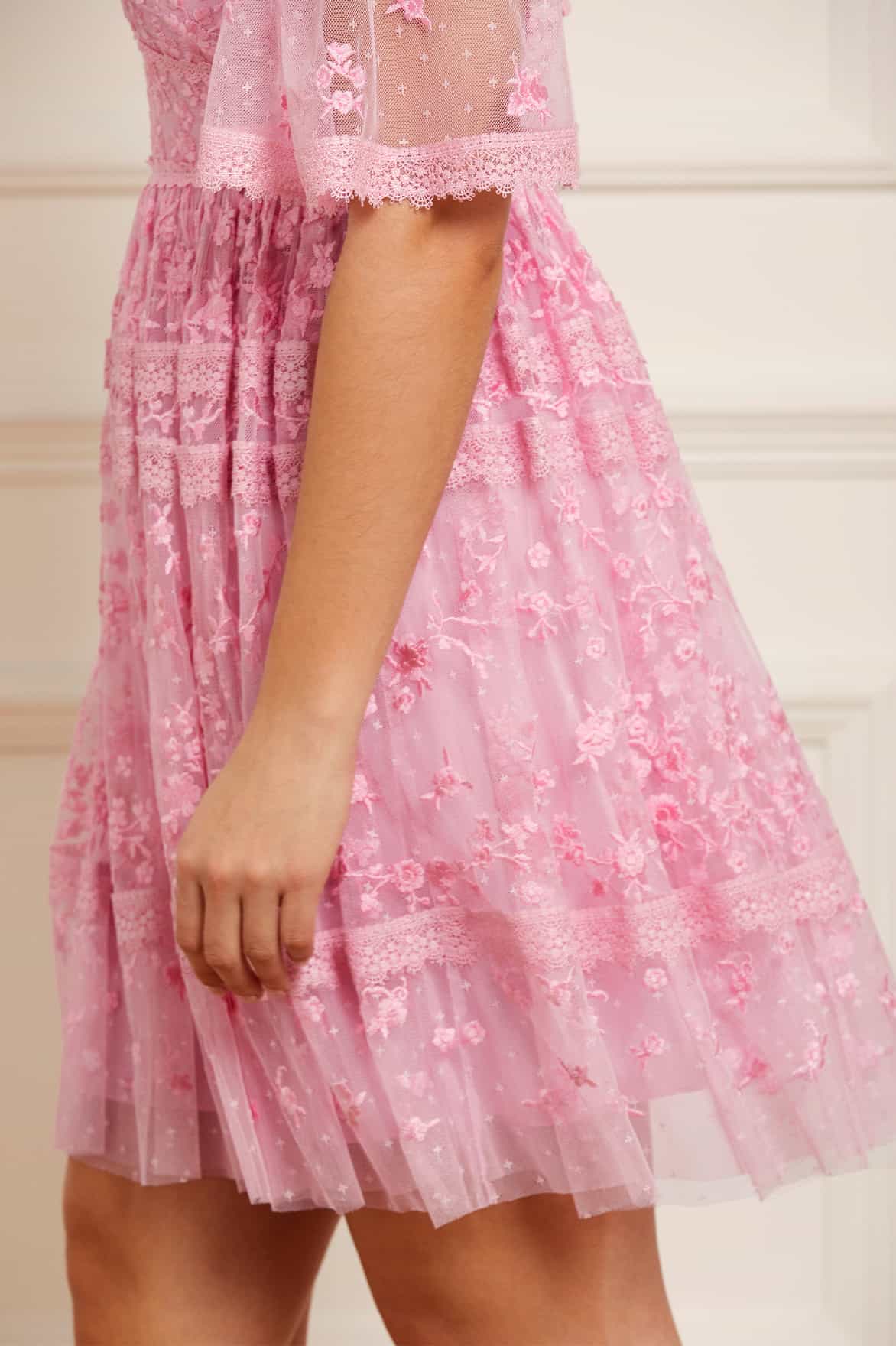 The Sweetheart Lace Mini Dress in Bright Pink. A signature Needle & Thread style, delicately embroidered with a floral lace artwork. Designed with intricate trimmed lace in pretty border motifs and perfectly positioned tiers through the skirt. Crafted from soft, kisses tulle creating a romantic texture throughout. The perfect mini dress to take you from day to night.