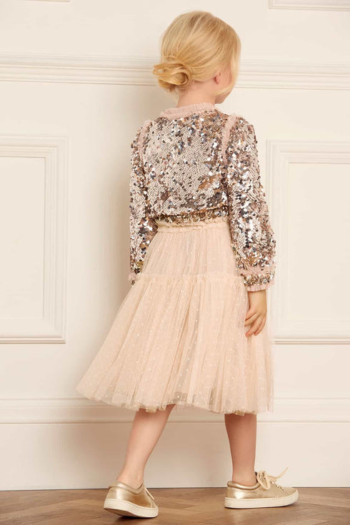 The Tulle KIDS Skirt in Dust Beige. The skirt is developed with layers of net and tulle for a floaty, playful hemline. Designed with a tiered hem frill for extra frothy, voluminous styling—perfect for twirling. Adorned with signature Needle & Thread frills at the waistband and skirt tier. Designed to be styled with our Hallie Kids Bomber Jacket, to create the perfect statement party co-ord.