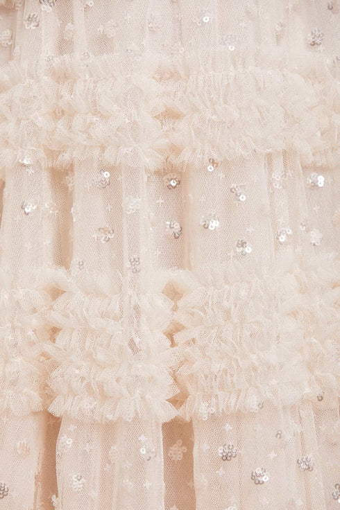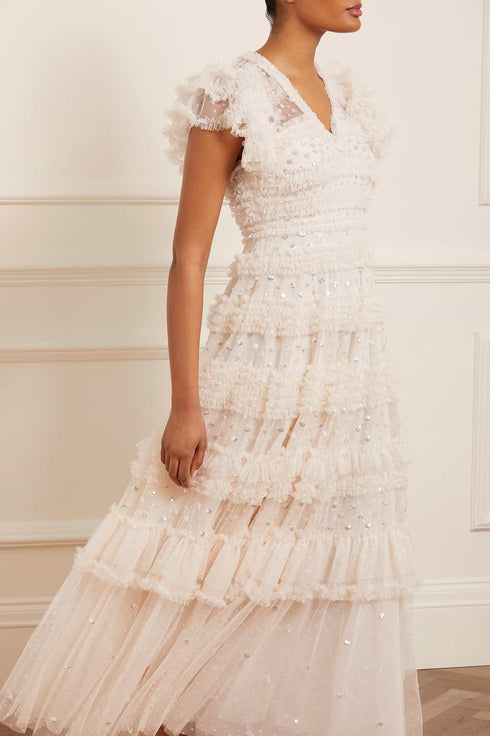 The Vivian V-Neck Gown in Cream. A signature Needle & Thread style statement. Beautifully printed with sequin polka dot motifs scattered throughout, creating an enchanting shimmer. Adorned with specially sourced sequins to create a sparkling effect throughout. This romantic style features tulle frills in perfectly positioned rows, creating a soft, frothy texture. Developed with generous ruffled sleeves and a V-neckline for a contemporary look. A style you'll wear time and time again.