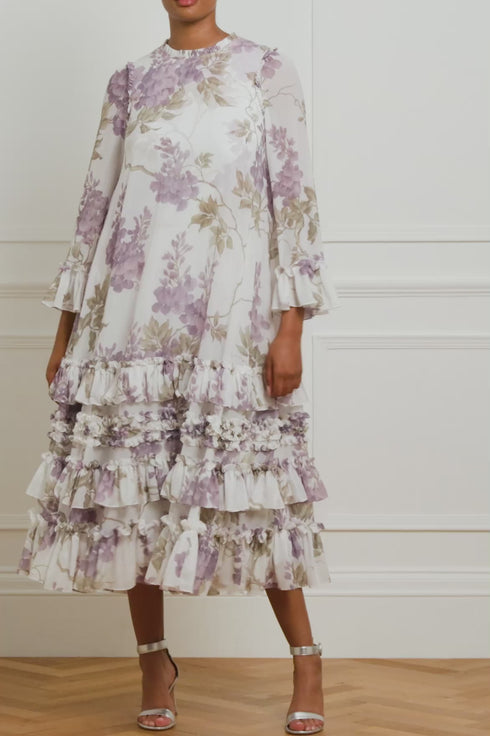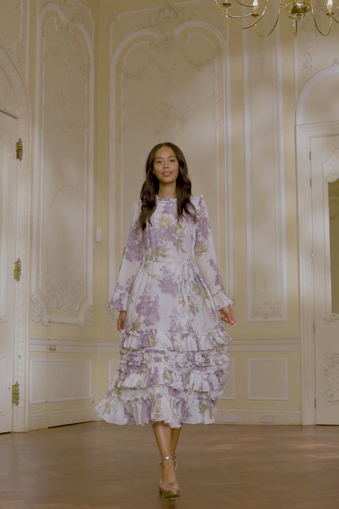 The Wisteria Chiffon Round Neck Ankle Gown in Moonshine. This romantic gown is inspired by an early 1900s hand-painted upholstery design. Beautifully printed with large wisteria florals in soft, muted tones, creating a statement design. Developed with a soft chiffon fabric and a loose-fitting silhouette for a floaty look. This gown is engineered with frills at the neckline and hem for a relaxed, signature Needle & Thread design. Make this style your new wardrobe staple.