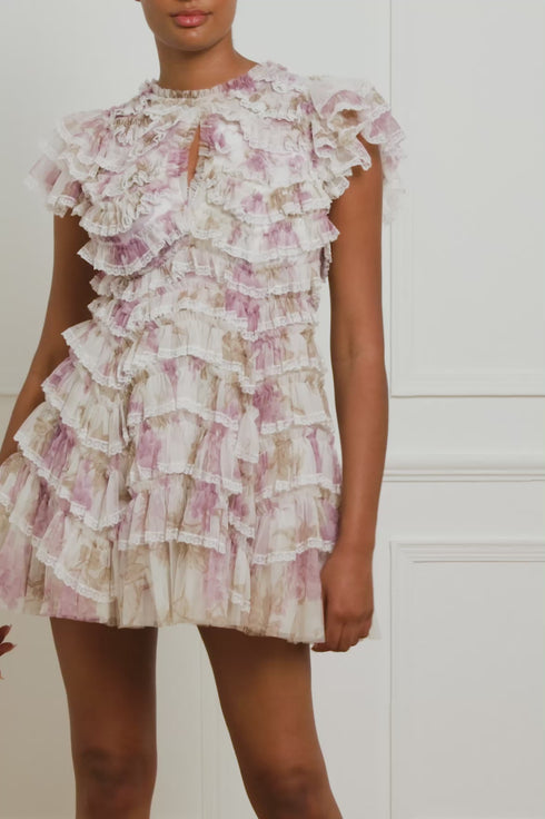 The Wisteria Ruffle Lace Micro Mini Dress in Moonshine. This dress is inspired by an early 1900s hand-painted upholstery design. Beautifully printed with large wisteria florals in soft, muted tones, creating a statement design. This dress is adorned with tulle frills in a zig-zag patten, creating a romantic texture. Crafted with lace trims on the edge of each frill and a keyhole neckline for intricate signature Needle & Thread detailing. Expect all eyes on you in this magical, fun piece.
