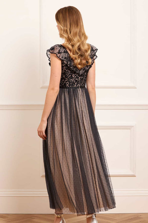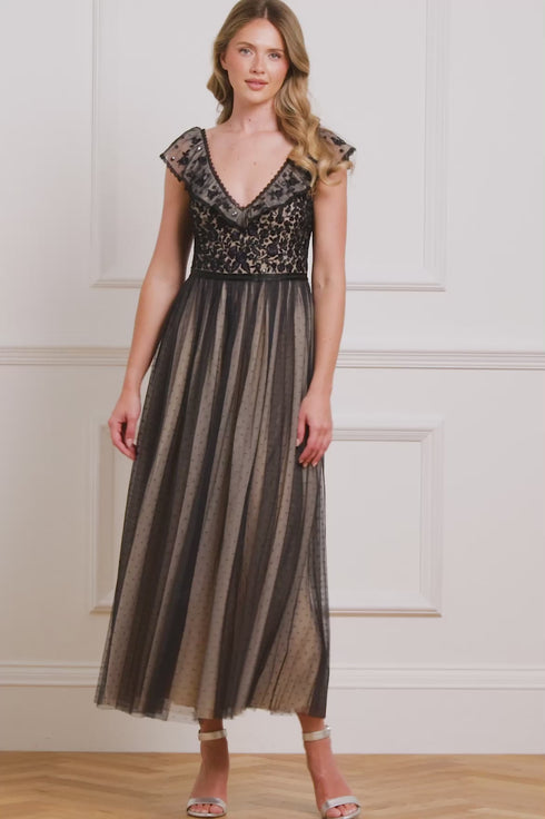 NEW SEASON. The Adeline Bodice Ankle Gown in Graphite/Beige. A true statement piece for the season. Crafted with heritage-inspired embroidery and signature kisses 'x' tulle, this gown is adorned with shimmering sequin accents that trail gracefully across the bodice and border the skirt in meticulously placed scallops and ribbon motifs. Designed to flatter, the fitted bodice and nipped-in waist create an elegant silhouette, falling into a soft, romantic skirt that glides at ankle length. A striking choice for black-tie events or formal winter soirées, embodying modern femininity with timeless charm.