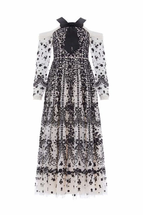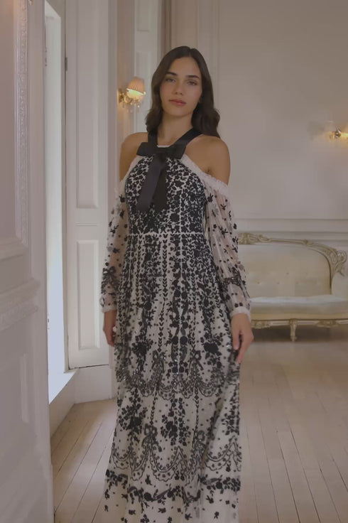 NEW SEASON. The Adeline Off-Shoulder Ankle Gown in Cream/Graphite. A dramatic take on evening elegance. Delicately embroidered with Victorian-era inspired florals, bows and scallops in contrast graphite thread, this off-shoulder silhouette embraces romance with a contemporary twist. Shimmering sequin embellishments enhance the flattering fitted bodice, while the ankle-length skirt flows into a cascade of softly glinting florals.