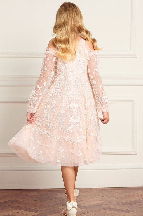 NEW SEASON. The Adeline Off-Shoulder Kids Dress in Opal/Cream. A soft, elegant piece with signature Needle & Thread charm. Victorian-inspired floral motifs and scalloped embroidery brings whimsical detail to the layered tulle. Perfectly pairs with the women’s Adeline Gown in the same colourway for matching occasionwear.