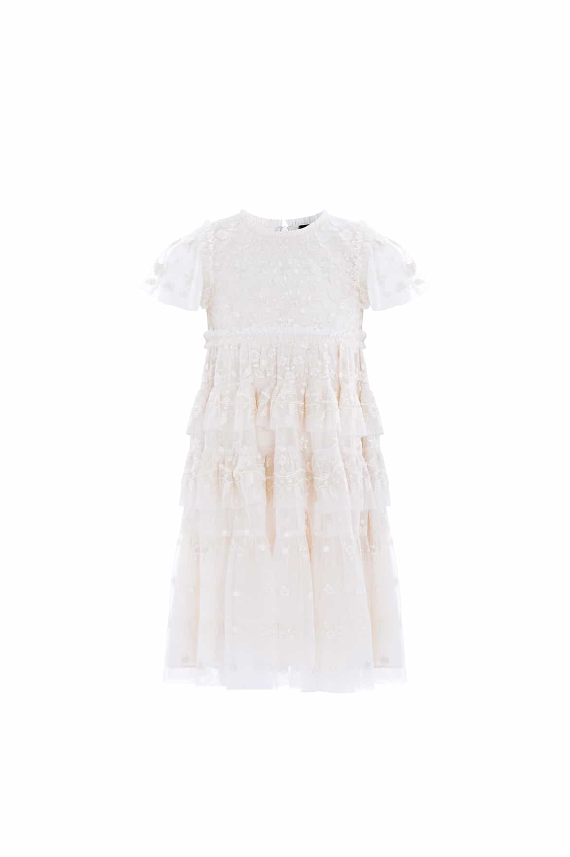 The Angelica Lace KIDS in Cream. This elegant dress is designed with intricate embroidery, inspired by Victorian lace trims. Tiered frills add a playful and charming quality to this timeless design. The ultimate addition to your little one's wardrobe.