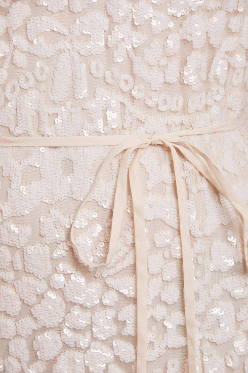 The Annie Sequin Tiered Mini Dress in Champagne. Adorned with shimmering sequins in a floral and bow artwork, this mini dress is inspired by a lace tablecloth. Designed with a loose fit silhouette and tiered throughout, creating beautiful movement. Make an effortless statement.