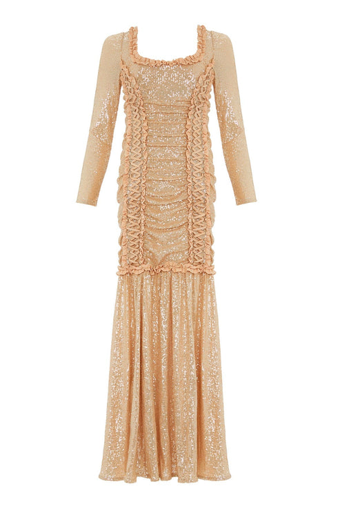 The Arabella Long Sleeve Gown in Parchment/Metallic. This statement piece has a slim, flattering silhouette. It is crafted from a stretch mesh base and features intricate sequin detailing that creates a captivating shimmer. The body is softly ruched, with a drop hem tier adorned with satin frills. Designed with satin lace-up detailing, threaded through silver eyelets, accentuates the gown's contour. Developed with long, slim sleeves gently gathered and embellished with sequins for added elegance. The epitome of luxury and glamour.