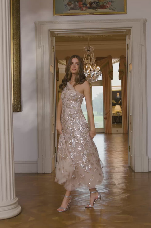 NEW SEASON. The Baroque Floral One-Shoulder Bow Ankle Gown in Oyster. A show-stopping piece with heritage drama, this gown draws on ornate 18th-century motifs reimagined in a modern silhouette. Designed with floral and scroll sequin embellishment, the asymmetrical neckline is adorned with a statement bow for couture-level impact. In soft oyster, this gown feels romantic, regal, and red carpet ready.