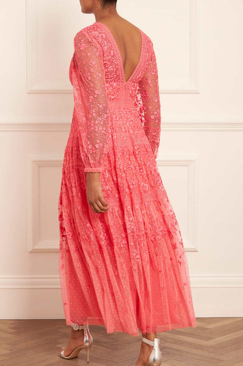 The Celestia Ribbon Ankle Gown in Sky Pink. This gown has been intricately designed with rich embroidery inspired by vintage lace, featuring delicate floral motifs and ribbon bows throughout. Crafted with pretty lace trims for signature Needle & Thread detailing, and delicately constructed with a textured tulle fabric base. Featuring a V-shaped neckline and a new, ultra-flattering silhouette. Make the ultimate statement in the Celestia.