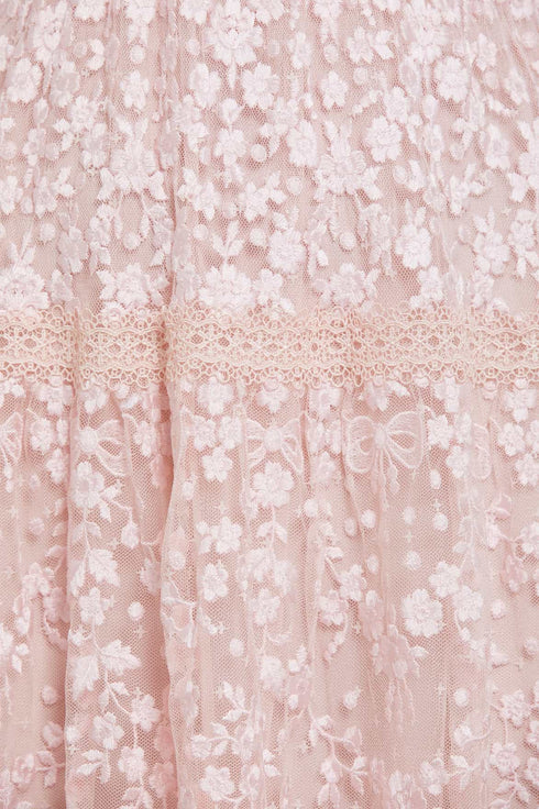 The Celestia Ribbon Mini Dress in Petal Pink / Pale Pink. This mini dress has been intricately designed with rich embroidery inspired by vintage lace, featuring delicate floral motifs and ribbon bows throughout. Crafted with pretty lace trims for signature Needle & Thread detailing, and delicately constructed with a textured tulle fabric base. Featuring a V-shaped neckline and a new, ultra-flattering silhouette. Make the ultimate statement in the Celestia.