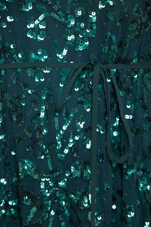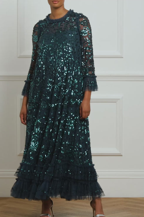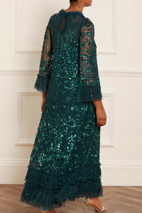 The Celia Long Sleeve Ankle Gown in Emerald. This statement gown is designed with romantic artwork featuring ornate florals and ribbon bows, densely embellished with shimmering sequins for exquisite detailing. Designed with an effortless loose fit with soft, playful tulle frills on the hem and cuffs. A key piece in our collection.