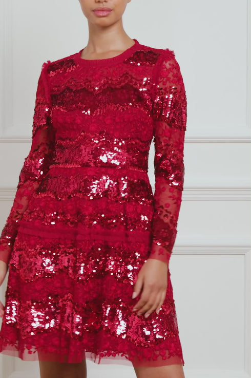 The Chantilly Sequin Micro Mini Dress in Deep Red. A signature silhouette for Needle & Thread, featuring double layers of net to hold this elegant shape for the most flattering look. The artwork is inspired by 1930s styling, featuring floral embroidery in rich tonal shades and high impact sequin stripes. Make time to shine in the Chantilly