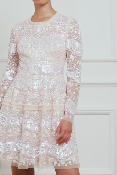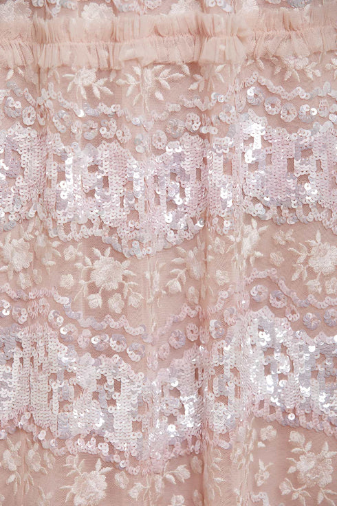 The Chantilly Sequin Micro Mini Dress in Petal Pink. A signature silhouette for Needle & Thread, featuring double layers of net to hold this elegant shape for the most flattering look. The artwork is inspired by 1930s styling, featuring floral embroidery in rich tonal shades and high impact sequin stripes. Make time to shine in the Chantilly