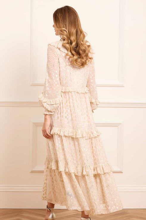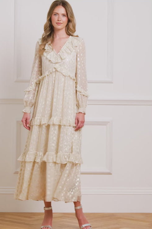 NEW SEASON. The Cherie Lurex Ankle Gown in Opal. A subtly sparkling style, crafted from fluid georgette with metallic lurex thread. With a softly gathered silhouette and romantic long sleeves, this gown glimmers gently as it catches the light. An elegant option for unforgettable moments.