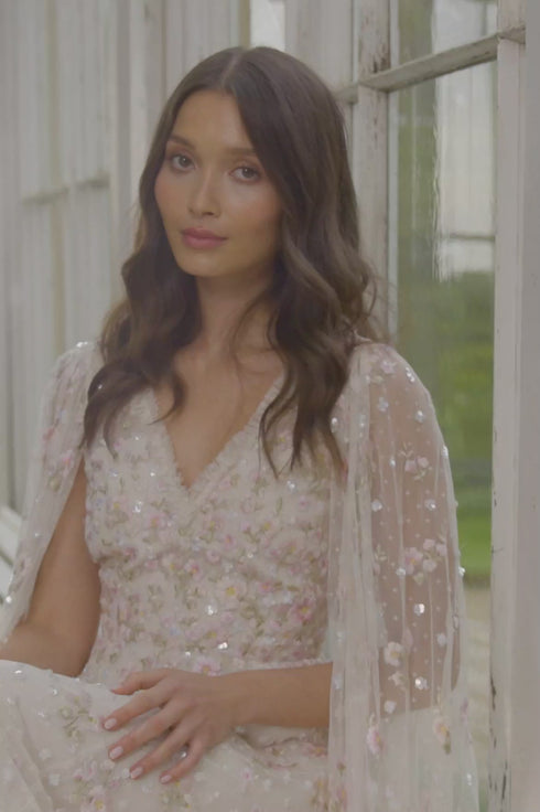 The Dahlia Ditsy Ankle Gown in Cream. This gown is beautifully decorated with shimmering silver sequins in delicate dot motifs and intricate floral embroidery in pastel pink tones. Featuring our new floor-length cape for romantic detailing. Developed with layers of net and tulle for a full and voluminous skirt. The perfect statement style for a special occasion.