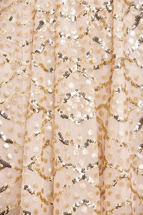 The Deco Dot Gloss Ankle Gown in Cream / Gold. Created with beautiful artwork inspired by 1930’s art deco styling. This gown features exquisite, high-shine sequins featuring an extra foil coat finish for an ultra-shimmering effect. Developed with layered tulle sleeves with a sequin border edge for a romantic look. Expect all eyes on you in this statement piece.