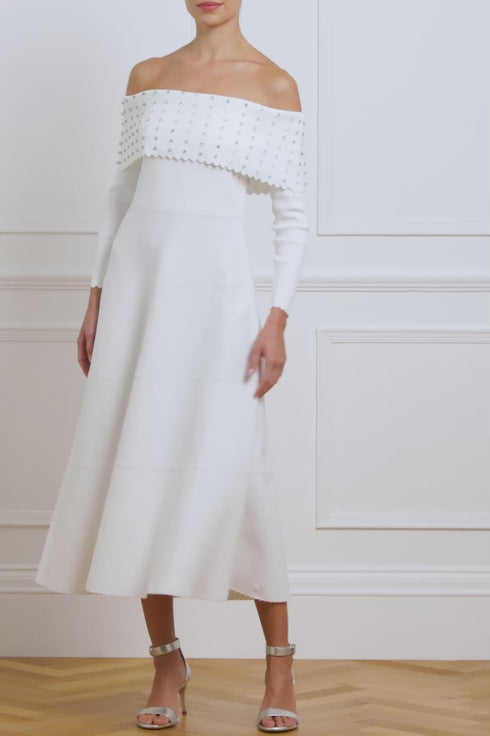 The Embellished Bardot Knit Gown in Cream. This knitted gown is developed from a recycled viscose blend, with stretch yarn for a beautiful, flattering texture. It features a fitted stretch bodice, a feminine bardot neckline, slim sleeves, and scalloped trim details for a romantic look. The bardot neck is beautifully adorned with crystal gems in a linear pattern for a signature Needle & Thread feminine touch.