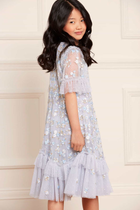 NEW SEASON. The Evening Primrose KIDS Dress in Cornflower Blue. This dress is decorated with intricate floral embroidery, inspired by a 1930’s tea dress. Beautifully engineered with chevron frills on the hem. Developed with our signature Needle & Thread tulle. The perfect dress for all your little one's upcoming occasions.