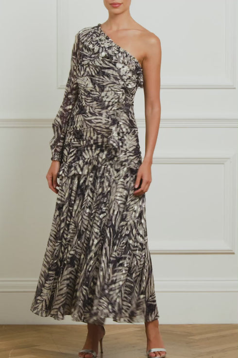 The Feather Lurex One-Shoulder Ankle Gown in Midnight/Beige. This ankle gown features a gold feather lurex print inspired by costumes worn by the Follie’s dancers of the early 1900s. The feather print is hand-painted in-house creating a subtle watercolour effect. This playful one-shoulder dress boasts a flattering gathered ruche detail engineered across the body and adorned with signature Needle & Thread frill detailing. Designed with a blouson sleeve featuring a ruffle cuff and romantic frills. The slim silhouette includes a dropped waist seam with a flirty frill tier. The stretch lining fabric ensures fit and comfort.