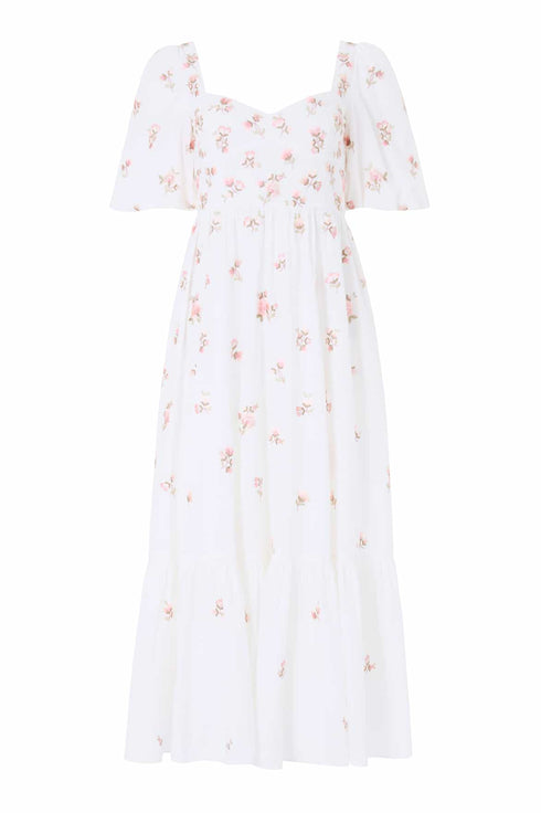NEW SEASON. The Flora Ditsy Cotton Ankle Gown in Chalk. Crafted from breathable cotton and adorned with delicate ditsy florals, this ankle gown captures the softness of late summer gardens. The flattering silhouette falls into a flowing skirt for natural movement and ease.