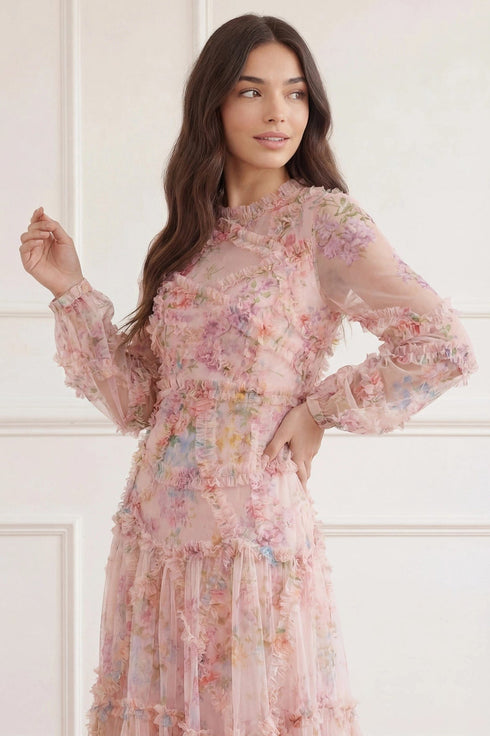 NEW SEASON. Floral Diamond Ruffle Gown in Topaz Pink. This eye catching piece is crafted from delicate ruffled tulle with an all over vintage print taken from an early 1900's hand painted fabric design. A romantic look featuring voluminous cuffed sleeves and a flattering skirt that skims the body to gently increase in fullness, creating stunning movement within the tulle. This Victorian inspired look with a contemporary edge will be the star of your wardrobe.