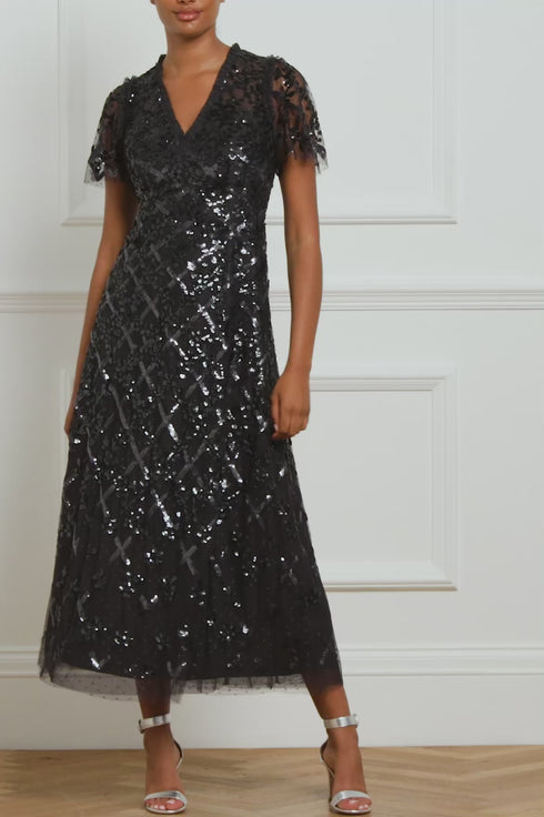 The Garden Lattice Ankle Gown in Graphite. This gown is designed with beautiful artwork incorporating delicate florals in a grid layout. Decorated with two sequin colours to highlight the definition of the design. Crafted with a V-shaped waist creating a flattering, easy-to-wear silhouette. Make a statement this season in the Garden Lattice.