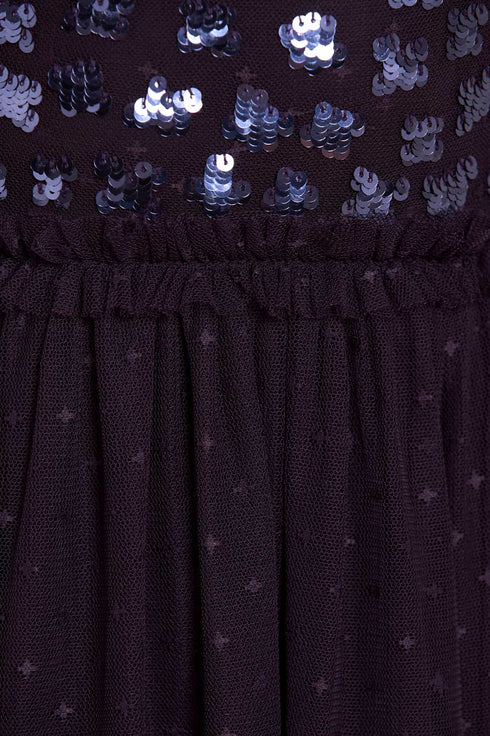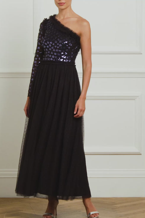 NEEDLE & THREAD EXCLUSIVE. The Glisten Bodice One-Shoulder Ankle Gown in Midnight. Beautifully designed with an elegant one-shoulder featuring signature Needle & Thread tulle frills at the neckline and waist. The bodice is adorned with delicate shimmering sequin motifs, while the slim-fitted sleeve are decorated with sparkling embellishments. The skirt features layers of signature Needle & Thread soft tulle for a romantic look. The perfect gown for an upcoming special occasion.