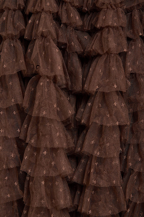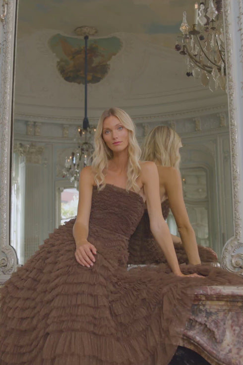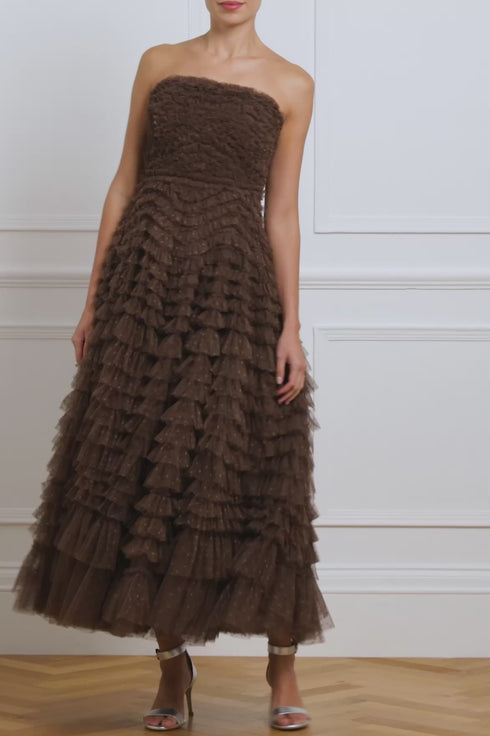 The Hattie Ruffle Strapless Ankle Gown in Chocolate. This gown is elegantly developed with layers of frothy tulle creating a soft, wavy textile. This strapless gown features signature Needle & Thread ruffles and frills for intricate, romantic detailing. Make the ultimate statement in the Hattie at your next event.