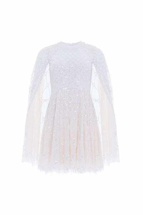 The Heart Lattice Micro Mini Dress in Cream. This dress is decorated with intricate embellishment made using the smallest sequins for exquisite detailing. Beautifully designed with heart-shaped motifs in a lattice layout. This dress features a cape for romantic detailing and a statement look. Make an entrance at your next event.