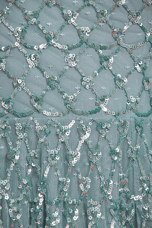 NEW SEASON | NEEDLE & THREAD EXCLUSIVE. The Heart Lattice Micro Mini Dress in Thistle Blue. This dress is decorated with intricate embellishment made using the smallest sequins for exquisite detailing. Beautifully designed with heart-shaped motifs in a lattice layout. This dress features a cape for romantic detailing and a statement look. Make an entrance at your next event.