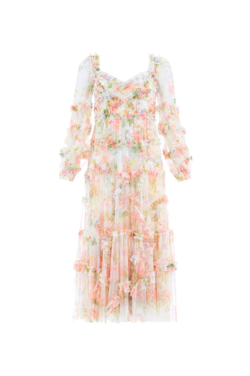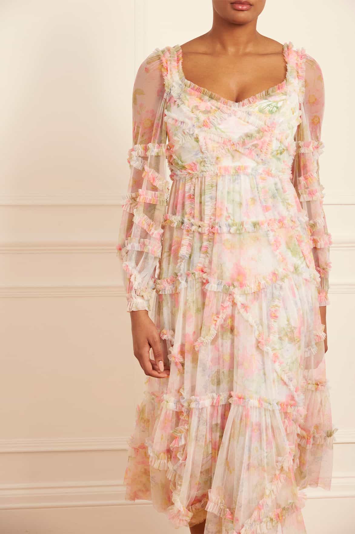 The Immortal Rose Maeve Long Sleeve Ballerina Dress in Moonshine. This beautiful dress features a romantic print captured from an antique, hand-painted artwork from the early 1900s. Decorated with wild rose motifs in soft pink shades intertwined with green foliage. Developed with our signature Needle & Thread textile tulle and gathered frills perfectly engineered around the body. The perfect dress for an upcoming special occasion.