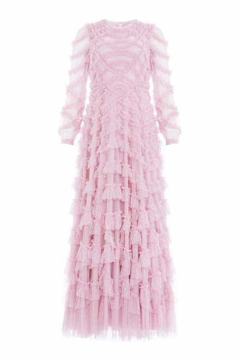 The Lana Round Neck Gown in Misty Lilac. This beautiful gown is adorned with engineered tulle frills to create a romantic textile. Developed with a round neckline and long sleeves for an elegant look. Beautifully crafted with layers of soft tulle for a whimsical, statement texture. Expect all eyes on you in this magical Needle & Thread piece.