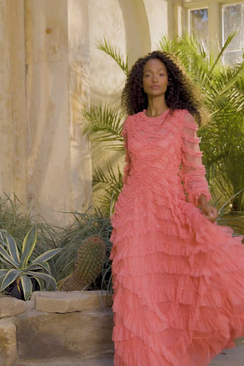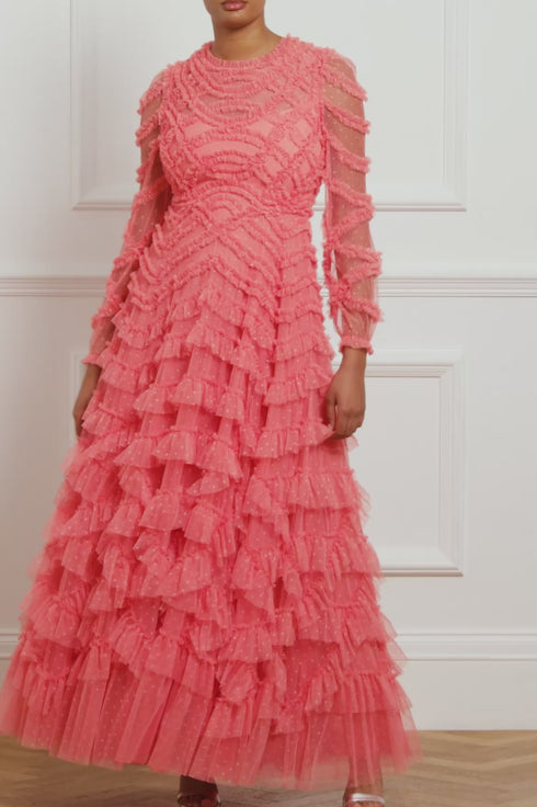The Lana Round Neck Gown in Pink Sky. This beautiful gown is adorned and engineered with tulle frills to create a romantic textile. Developed with a round neck design and long sleeve for an elegant look. Beautifully crafted with layers of soft tulle for a whimsical, statement texture. Expect all eyes on you in this magical Needle & Thread piece.