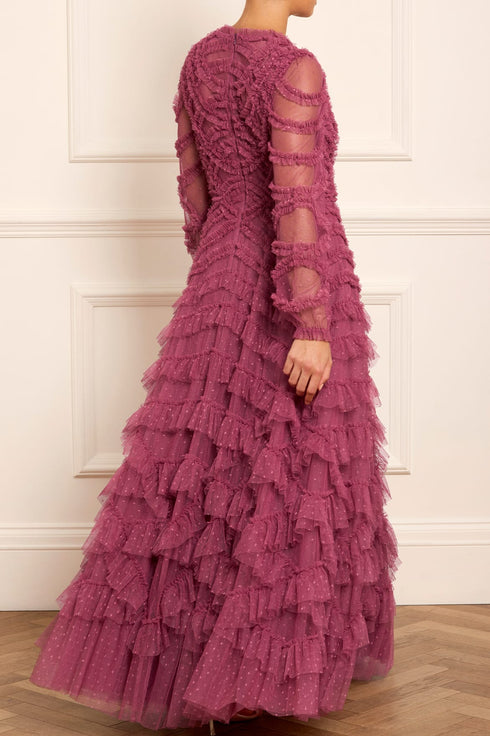 The Lana Round Neck Gown in Pink Topaz. This beautiful gown is adorned with engineered tulle frills to create a romantic textile. Developed with a round neckline and long sleeves for an elegant look. Beautifully crafted with layers of soft tulle for a whimsical, statement texture. Expect all eyes on you in this magical Needle & Thread piece.
