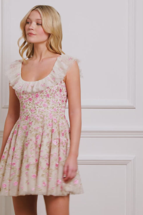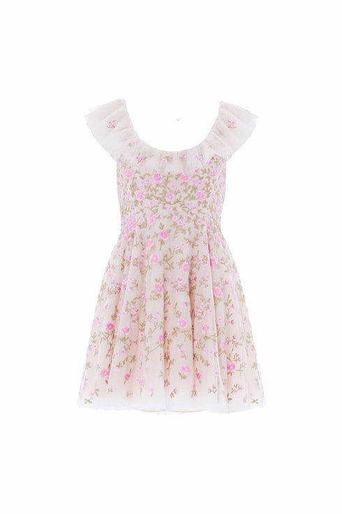 The Lea Ditsy Micro Mini Dress in Cream/Pink features delicate floral motifs inspired by 1900s archive paintings. The scoop neckline is adorned with tulle frills and whimsical floral embroidery. The playful skirt is made of layers of soft tulle, adding a romantic touch. A perfect choice for your next special occasion.