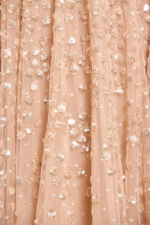 The Leila Dot V-Neck Cape Mini Dress in Parchment is embellished with shimmering clustered dot motifs for a sparkling effect. This elegant V-neck dress features slim sleeves and signature Needle & Thread tulle frills at the neckline and armholes. The skirt, crafted from layers of net and tulle, finishes with a floaty hemline. A captivating design.