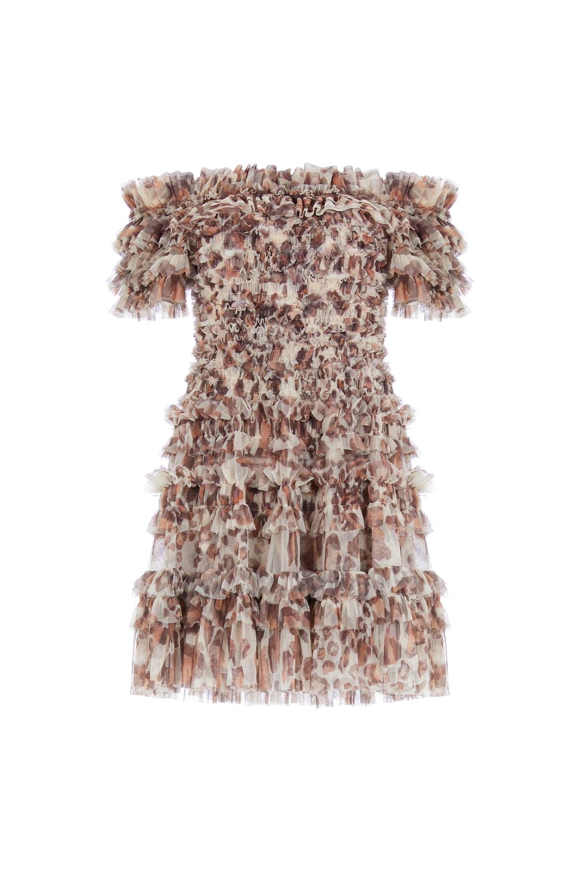 - Leopard printed tulle decorated with printed ruffles