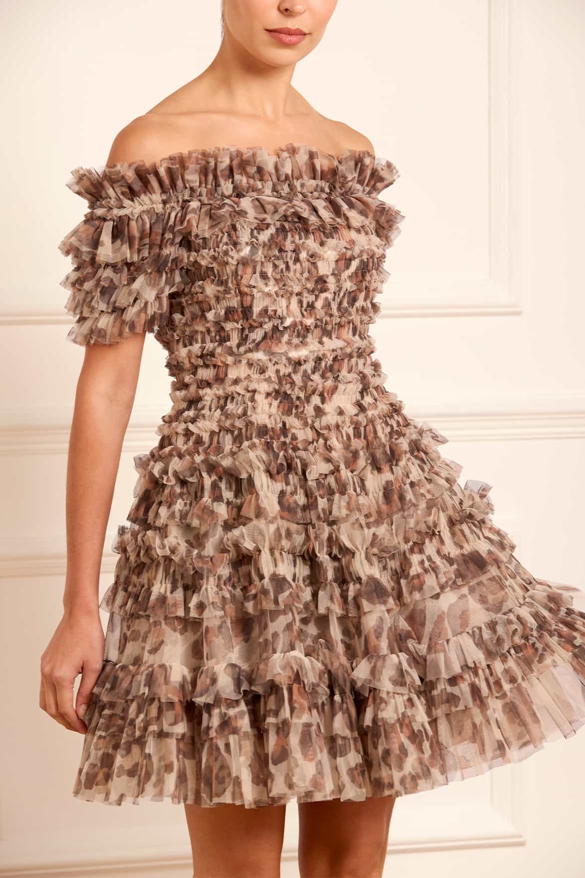 The Leopard Lisette Off-Shoulder Micro Mini Dress in Moonshine. This dress features a statement print that was hand-painted in-house using watercolour, with soft leopard motifs varying in scale and showcasing watery definition. This statement dress has an elegant off-the-shoulder design inspired by Hollywood styling. Crafted with textile tulle and double-stitched frills for a dramatic, romantic effect. Features an integrated corset for a perfect fit and to hold the silhouette. Expect all eyes on you in this romantic dress.